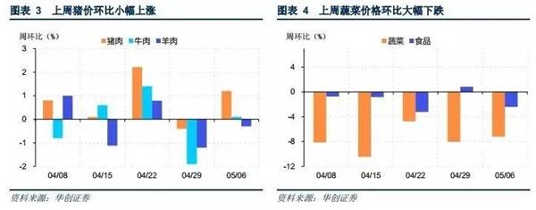 上周農(nóng)產(chǎn)品價(jià)格總體上延續(xù)下跌走勢(shì),豬肉價(jià)格小幅上漲,蔬菜價(jià)格大幅下跌。上周五,農(nóng)產(chǎn)品批發(fā)價(jià)格總指數(shù)收于205.87,環(huán)比下跌1.64%;菜籃子產(chǎn)品批發(fā)價(jià)格指數(shù)收于208.04,環(huán)比下跌1.91%。從細(xì)項(xiàng)數(shù)據(jù)看,22個(gè)省市平均豬價(jià)環(huán)比上漲0.8%;牛肉下跌0.8%;羊肉上漲1.0%(圖表3)。上周蔬菜價(jià)格環(huán)比下跌8.14%,水果價(jià)格環(huán)比下跌0.72%(圖表4)。國(guó)內(nèi)5月生豬供應(yīng)缺口較大,屠宰企業(yè)存在一定采購(gòu)壓力,壓價(jià)情緒較高,雖然部分省市儲(chǔ)備肉陸續(xù)投放,平抑市場(chǎng)肉價(jià),但短期供應(yīng)緊缺格局難改,國(guó)內(nèi)豬價(jià)可能小幅上揚(yáng)。隨著氣溫回暖,蔬菜供給增加,價(jià)格還有下降空間。