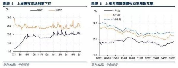 上周五銀行間質(zhì)押式回購(gòu)利率R001收于2.0234%,環(huán)比下行8.01bp;R007收于2.4255%,環(huán)比下行9.03bp(圖表5)。上周各期限國(guó)債收益率漲跌互現(xiàn),上周五1年期和10年期國(guó)債收益率環(huán)比分別上行3.33bp和1.03bp,5年期下行0.39bp(圖表6)。上周共有5800億元逆回購(gòu)到期,均為7天到期逆回購(gòu)。央行通過逆回購(gòu)發(fā)行累計(jì)投放資金3600億元,期限均為7天,周凈回籠資金2200億元。