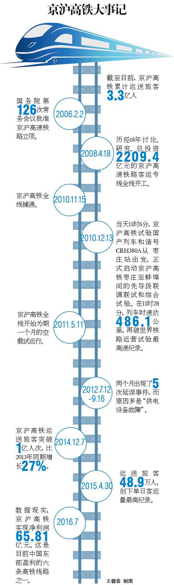 京滬鐵路全程1318公里,途經(jīng)24座城市的高鐵,也是當(dāng)時(shí)世界上技術(shù)標(biāo)準(zhǔn)最高的高體線(xiàn)路。2010年12月3日,“和諧號(hào)”CRH380A型高速動(dòng)車(chē)組列車(chē)在京滬高速鐵路棗莊至蚌埠試驗(yàn)運(yùn)行最高時(shí)速達(dá)486.1公里,開(kāi)創(chuàng)世界鐵路運(yùn)營(yíng)試驗(yàn)最高速度。