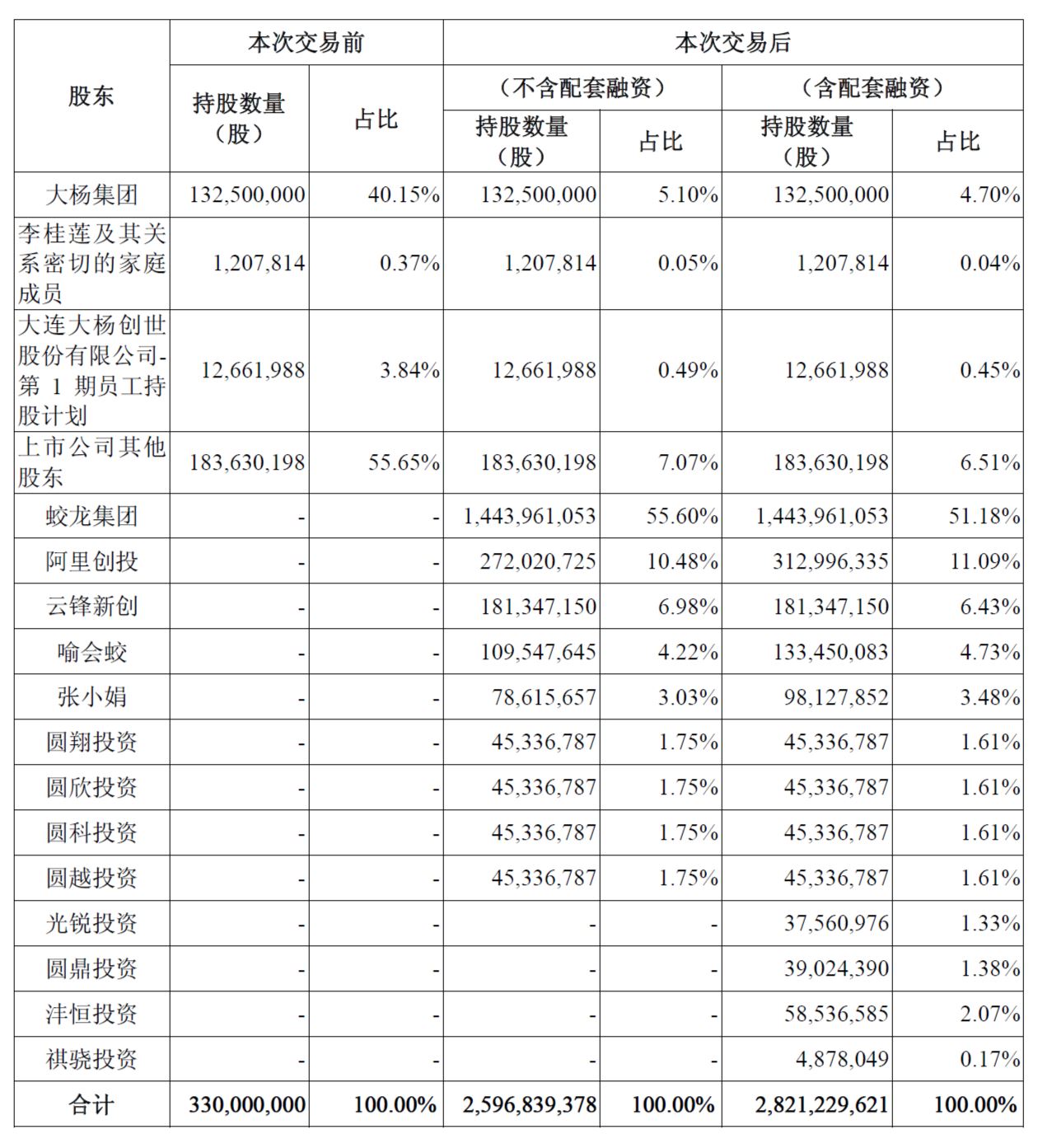 交易完成后,大楊集團(tuán)持股比例降至4.7%,不再是控股股東,李桂蓮不再是實(shí)際控制人。蛟龍集團(tuán)持有55.6%為新控股股東(不考慮配套融資),喻會(huì)蛟、張小娟夫婦為新實(shí)際控制人。