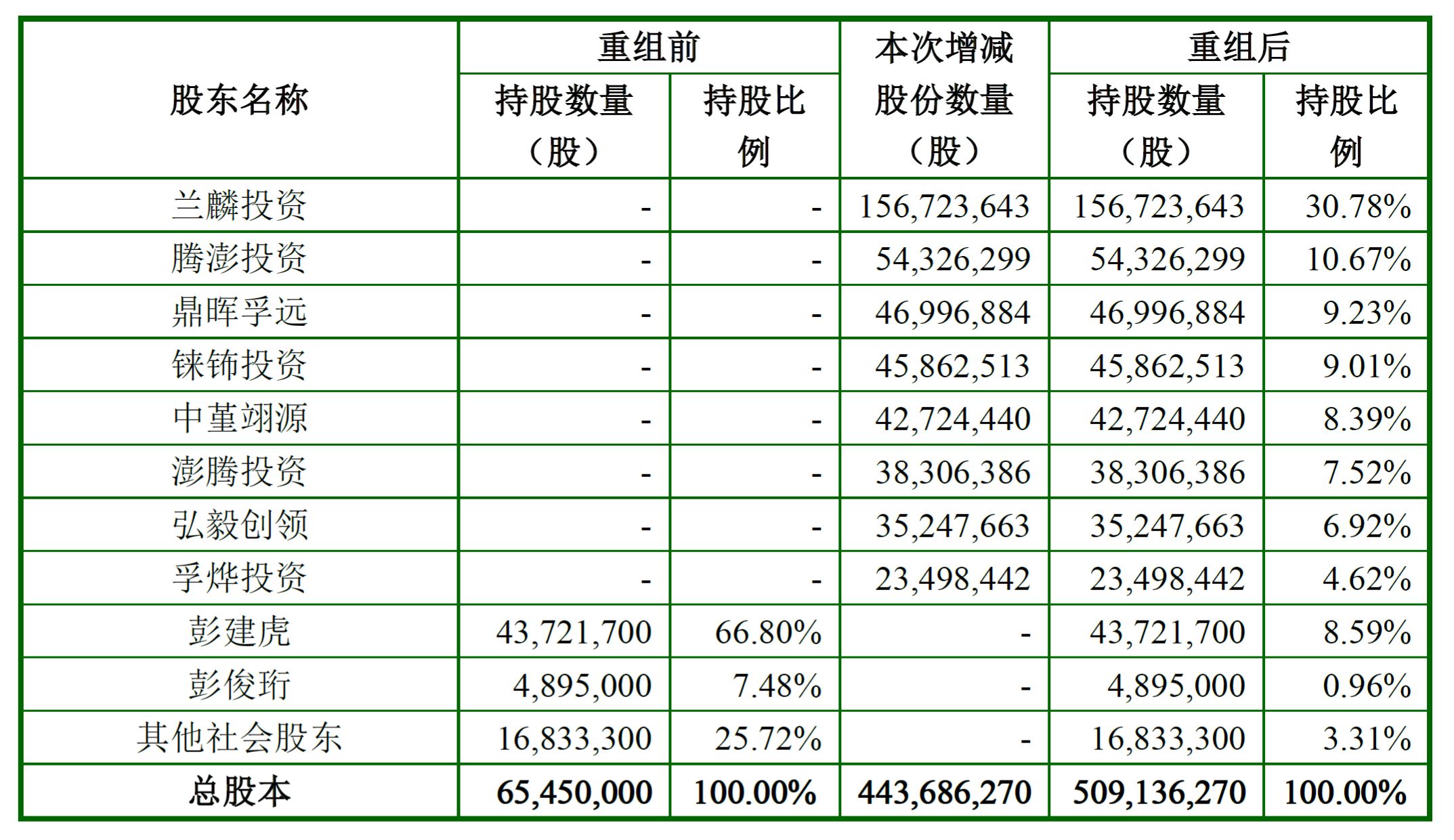 重組前,世紀(jì)游輪彭建虎及一致行動(dòng)人持有4861.67萬(wàn)股,占比74.28%,彭建虎為控股股東。重組完成后,彭建虎及其一致行動(dòng)人持股比例降至9.55%,不再是控股股東。蘭麒投資持有1.567億股、占比30.78%(不考慮配套融資),為新的控股股東,史玉柱成為實(shí)際控制人。