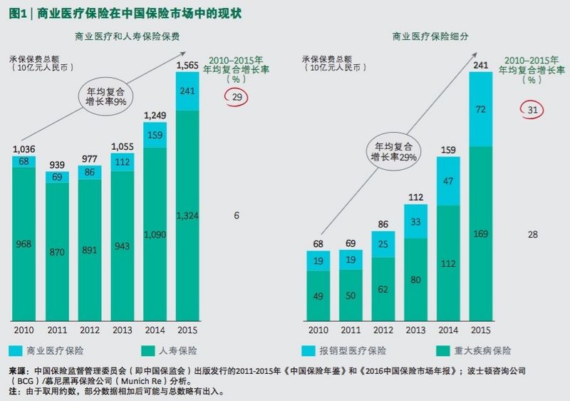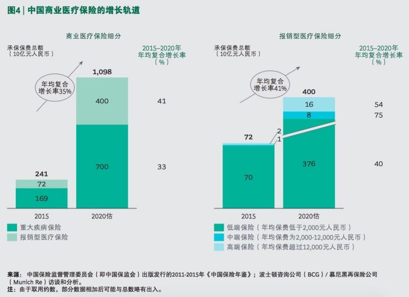8月24日,波士頓咨詢公司(BCG)與慕尼黑再保險(xiǎn)聯(lián)合發(fā)布報(bào)告。報(bào)告預(yù)測,到2020年,中國商業(yè)醫(yī)療保險(xiǎn)市場的規(guī)模將增長近四倍,從2015年的2410億元人民幣增至1.1萬億元人民幣,而且報(bào)銷型醫(yī)療保險(xiǎn)將超越重大疾病保險(xiǎn),成為中國商業(yè)醫(yī)保市場中增長最快的品類。