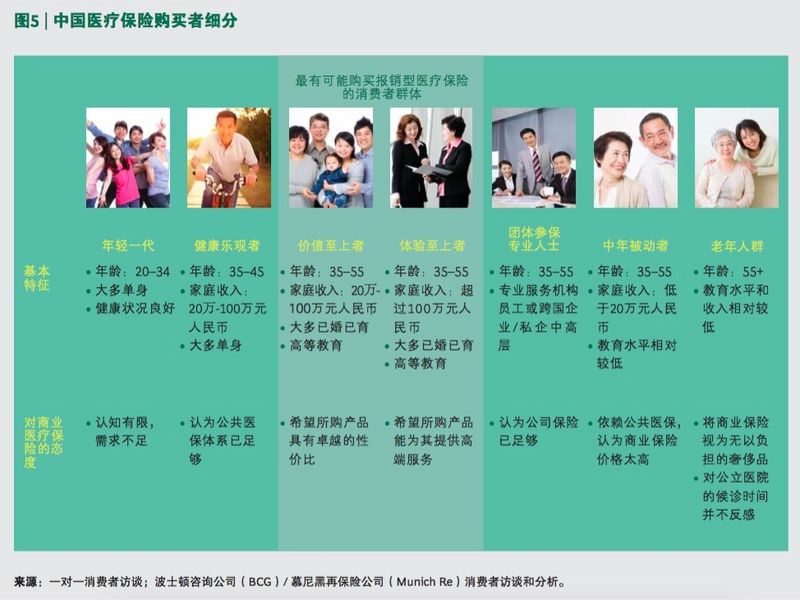 報(bào)告在調(diào)查了近千名中國消費(fèi)者之后,大致劃分了七類人群,其中兩類人群具有極高的報(bào)銷型醫(yī)療保險(xiǎn)購買潛力。第一類人群是體驗(yàn)至上,35歲至55歲之間,家庭收入超過100萬人民幣以上,往往希望擁有更輕松及比公共醫(yī)保相比更好的就醫(yī)體驗(yàn),至2020年,此類人群將突破400萬;第二類人群也是35隨至55歲之間,通常已婚已育,家庭收入在20萬至100萬之間,比體驗(yàn)至上人群對價(jià)格更敏感,屬于價(jià)值至上,至2020年人群規(guī)模將接近3800萬。