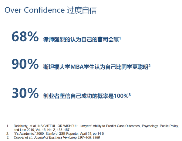 其次,大多數人都受到“過于自信的偏見(Over confidence bias)”的影響。過度自信偏見是指人們的習慣性過高估自己的技能和成功的機會。例如,上面的圖例中有不少過度自信的例子。