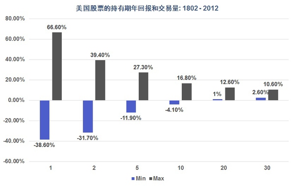 上面這張圖顯示的是美國股票市場在過去200年的回報范圍(扣除通貨膨脹后的真實回報)。在橫軸上你可以看到那些回報范圍被分成了1年,2年,5年一直到30年,也就是說該圖顯示的是在過去200年間的美國,任何1年,2年,5年,一直到30年的股市回報范圍。從圖中我們可以看到,如果一個投資者的投資維度比較短(比如1年),那么他從股市得到的回報會非常難以捉摸。在運氣好的時候,可能一年就能給他高達66%的回報。但如果運氣不好,那么他就可能虧損高達40%左右。
