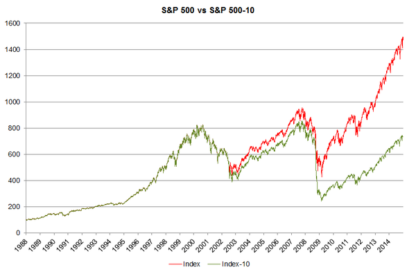 上圖顯示了從1988年到2014年標普500指數(紅線)在27年的時間里的回報,總共有6,824個交易日。