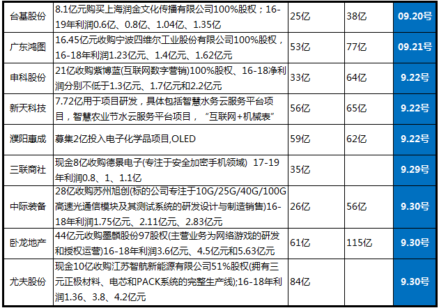 9月份主要選擇的公司停牌階段市值普遍較小、所涉及增發(fā)收購(gòu)?fù)庋邮劫Y產(chǎn)行業(yè)主要有職業(yè)教育、精準(zhǔn)廣告、新能源材料、光通訊、新能源汽車產(chǎn)業(yè)鏈,主要篩選公告內(nèi)容如下