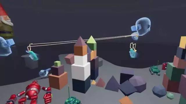拉奇的興致感染了我。我也沖他扔了一個(gè)大爆竹,但沒有擊中他,卻把一座塔給炸倒了。在這個(gè)名為“玩具盒”(Toy Box)的虛擬現(xiàn)實(shí)演示中,物體遵循著嚴(yán)格的物理學(xué)定律——其反彈和碰撞有著令人驚嘆的真實(shí)性,但它們之所以給人以真實(shí)感,很大程度上是因?yàn)槲铱梢院推渌婕覀円黄饌鬟f和分享物體,一起同心協(xié)力移動(dòng)它們。我并非與玩具相處,而是與他人共處。