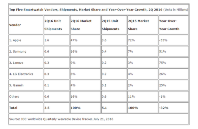 據(jù)IDC數(shù)據(jù),第二季度,全球智能手表出貨量為350萬(wàn)塊,較去年同期的510萬(wàn)塊下降了32%,為有史以來(lái)的首次同比下降,而蘋果是智能手表出貨量下滑的主要原因。