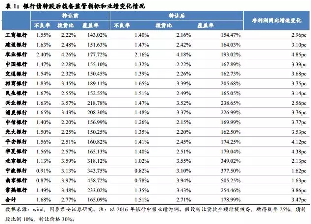因此,對于銀行而言,轉(zhuǎn)出撥備計提充分的不良,會貢獻(xiàn)賬面利潤。我們以銀行中報數(shù)據(jù)為起點,大致測算下,如果各銀行的不良貸款中有10%做債轉(zhuǎn)股轉(zhuǎn)出,不良撥備100%,轉(zhuǎn)讓價30%,那么將使利潤增速比原來增加1-5個百分點。