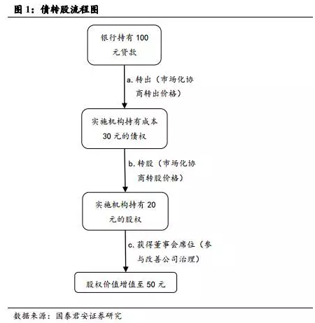 銀行持有一筆100元的貸款,借款企業(yè)經(jīng)營治理很糟糕,已劃為不良,經(jīng)評估覺得企業(yè)還不是完全沒救,準(zhǔn)備做債轉(zhuǎn)股。于是把貸款做價30元轉(zhuǎn)讓給實施機(jī)構(gòu)。然后實施機(jī)構(gòu)去和企業(yè)談轉(zhuǎn)股,100元債權(quán)轉(zhuǎn)成它20%的股權(quán)(注意,其成本是30元),并獲得董事會席位。然后,實施機(jī)構(gòu)參與改善公司經(jīng)營治理(由于負(fù)債下降,企業(yè)本身情況本身也會比從前好一些),從而使其股權(quán)升值,其持股價值達(dá)到50元,而后退出,獲利20元。