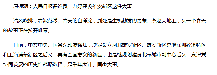 據(jù)新華社報(bào)道,日前,中共中央、國(guó)務(wù)院印發(fā)通知,決定設(shè)立河北雄安新區(qū)。這是繼深圳經(jīng)濟(jì)特區(qū)和上海浦東新區(qū)之后又一具有全國(guó)意義的新區(qū),也是深入推進(jìn)京津冀協(xié)同發(fā)展的一項(xiàng)重大決策部署,是千年大計(jì)、國(guó)家大事。