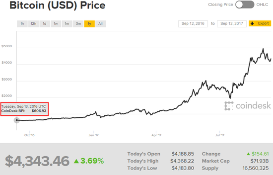 比特幣從去年今天的約600美元一枚,暴漲到當(dāng)前的4,352.59美元一枚,漲幅高達(dá)725%。而年內(nèi)新高時(shí)其一度逼近5000美元一枚。最近中國監(jiān)管機(jī)構(gòu)對(duì)電子貨幣首發(fā)(ICO)的禁令給比特幣蒙上了陰影。