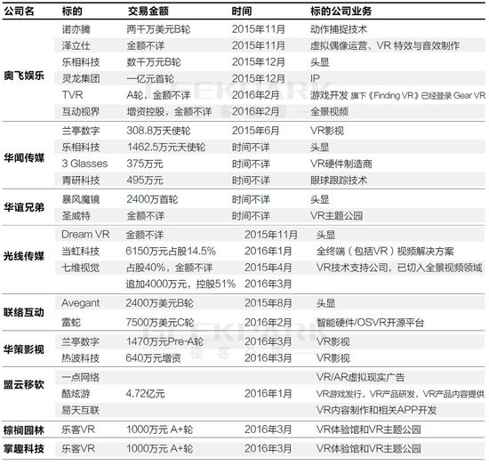 • 小米 :建小米探索實驗室,初期重點投入包含VR方向;與迅雷一起參與樂相B輪的1.8億元融資。
